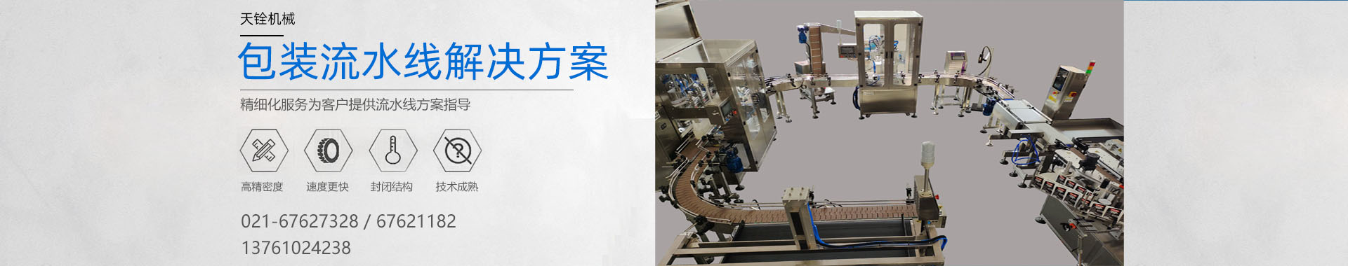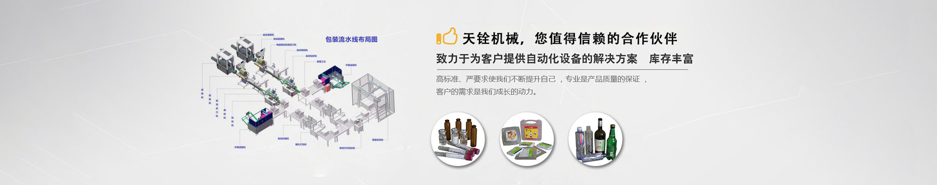 上海天铨机械设备有限公司,是专业从事于高性能自动化包装流水线及单机设备的设计、制造、销售、服务于一体的专业型制造商,产品远销美国、英国、加拿大、日本、韩国、澳大利亚、新西兰、新加坡、以色列、马来西亚、泰国、哥伦比亚、南非、等世界多个国家和地区,并追求“卓越的品质,优质的服务,合理的价格”的理念,受到国内外客户的青睐。